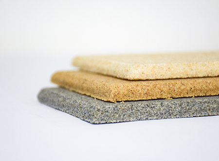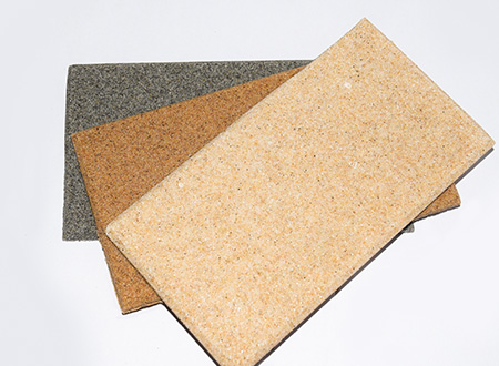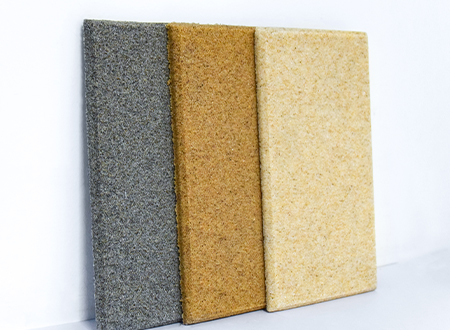 微粒材料是一種新型綠色裝飾材料,具備優(yōu)異的聲學性和物理性能。該材料是以天然砂粒或經(jīng)環(huán)保處理的固廢顆粒為骨料,以環(huán)保膠凝劑,通過壓振工藝,生產的具有大量相互連通的微小空隙的多孔材料。